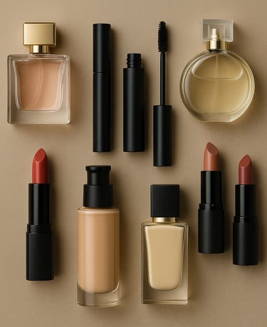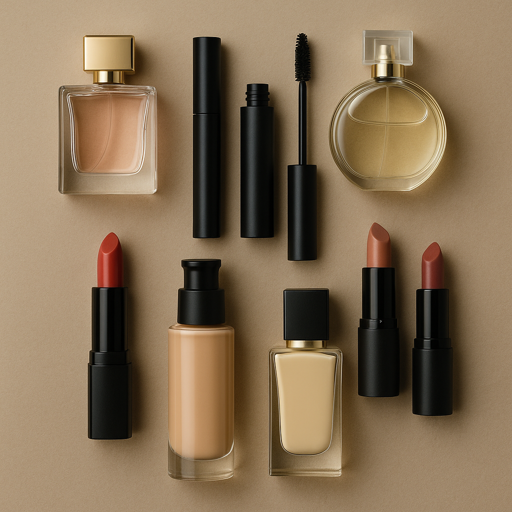 Parfüm, ruj, fondöten, maskara ve kişisel bakım ürünleri grubu.
